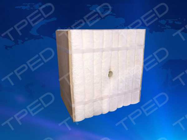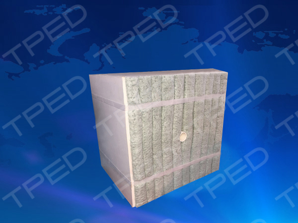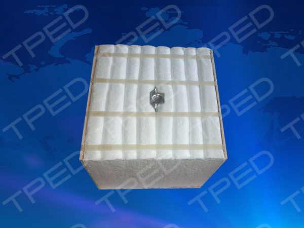 一、产品说明: 纤维模块是采用具有优良性能的对应材质的纤维针刺毯,按纤维模块结构、尺寸、由专业技工及加工专用设备制作而成,为保证壁衬砌筑完成后模块之间相互挤压形成无缝隙紧密的保温整体,在制作过程中均保持一定压缩量,为了简化和加快窑炉施工、提高炉衬整体性而推出的新型耐火炉衬制品。该产品尺寸规整,能直接固定于工业窑炉炉壳钢板锚固钉上,具有良好的耐火隔热效果,提高了窑炉耐火隔热的整体性,推动了窑炉砌筑技术的进步,该产品分类温度为1000-1600℃,用户可根据窑炉结构,采用不同纤维模块,还可根据用户要求加工制作。